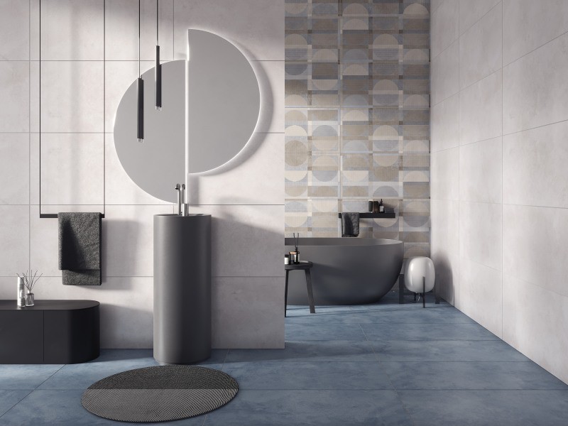 Декоративная коллекция керамогранита Vision станет настоящим украшением любых помещений. Основа интерьера — базовый керамогранит State под бетон в светло-серых, серых и синих тонах. В декоре сочетаются округлые и прямые линии внутри одного орнамента, что образует интересные хитросплетения. Это дизайнерское решение выглядит как дорогие обои или ткань на стенах. Декоративный керамогранит можно использовать как яркий акцент в спокойном пространстве, обыгрывая им минималистичные или лофтовые интерьеры.