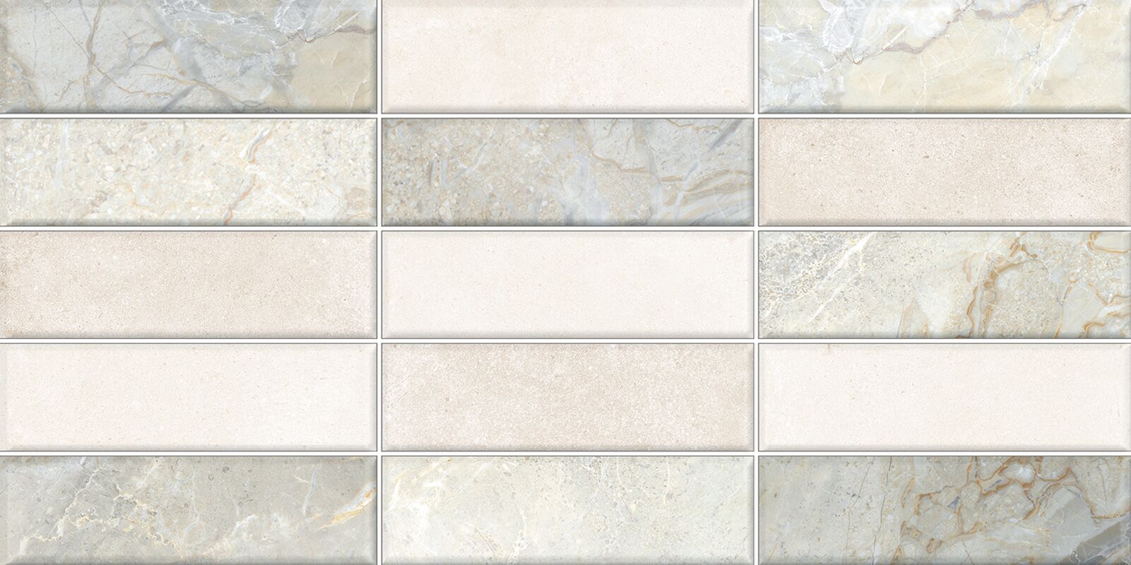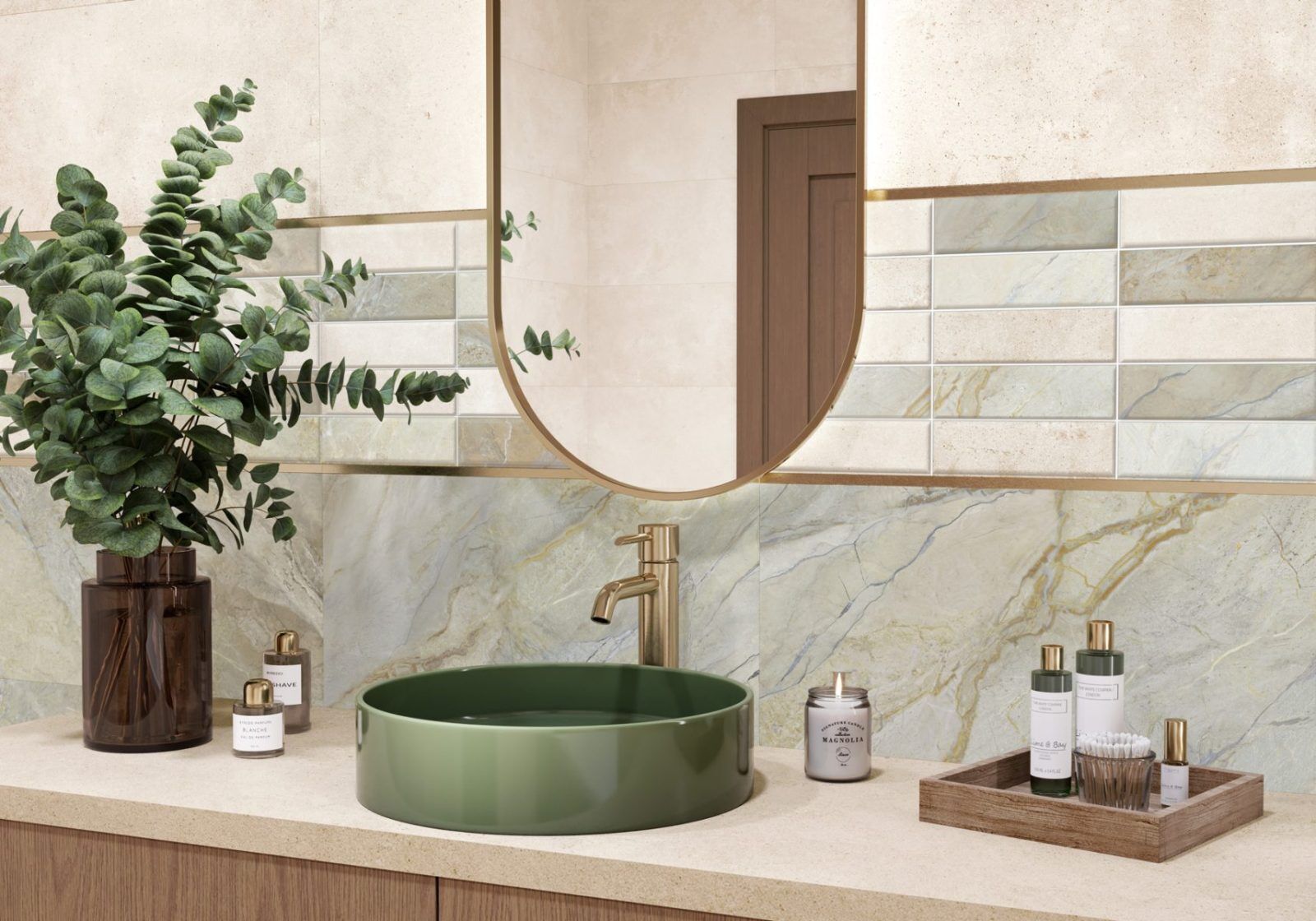 Глянцевая коллекция Arty — это сочетание текстуры разноцветного мрамора мятного оттенка и бежевого горного песчаника. Коллекция состоит из двух базовых плиток этих текстур и одного акцентного артикула, который объединяет их в прямоугольных фрагментах в виде кирпичей на рельефе. Такой набор элементов позволит создать индивидуальный дизайн, зонировать помещение и выделить функциональные зоны. Гармоничным сочетанием к этой серии станет плитка в виде деревянных плашек из коллекции Aurea. Дополняет композицию керамический бордюр 13×600 мм в платиновом цвете и матовый керамогранит в формате 600×600 мм.